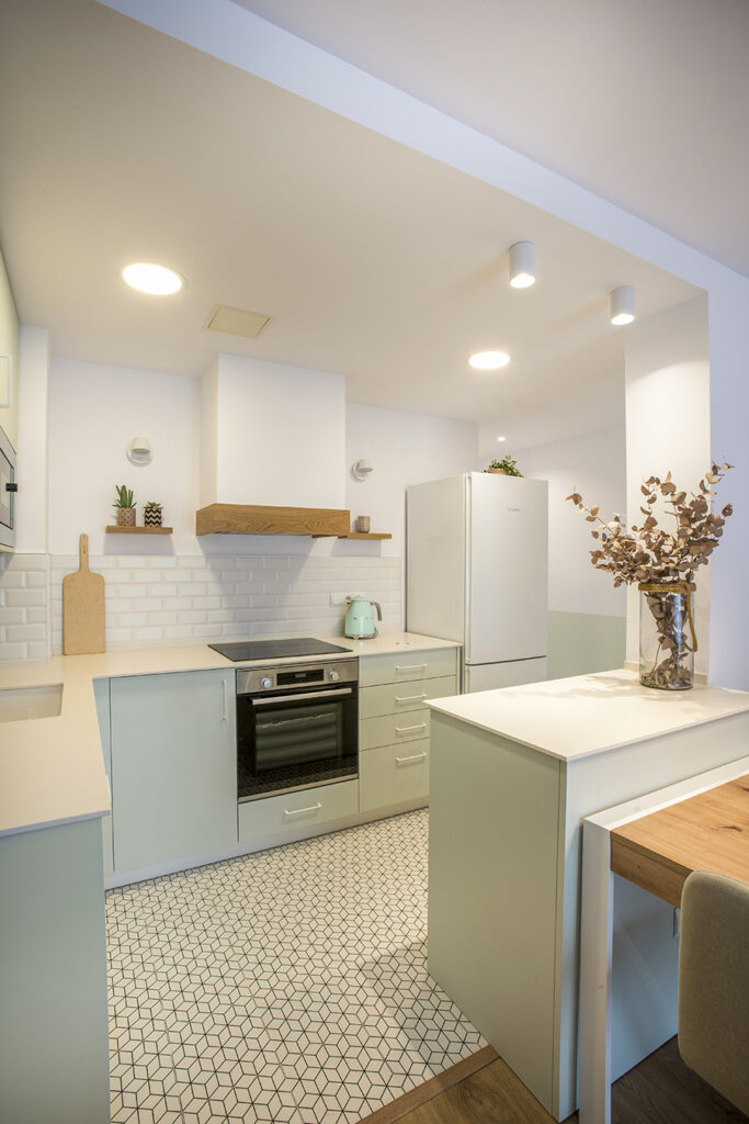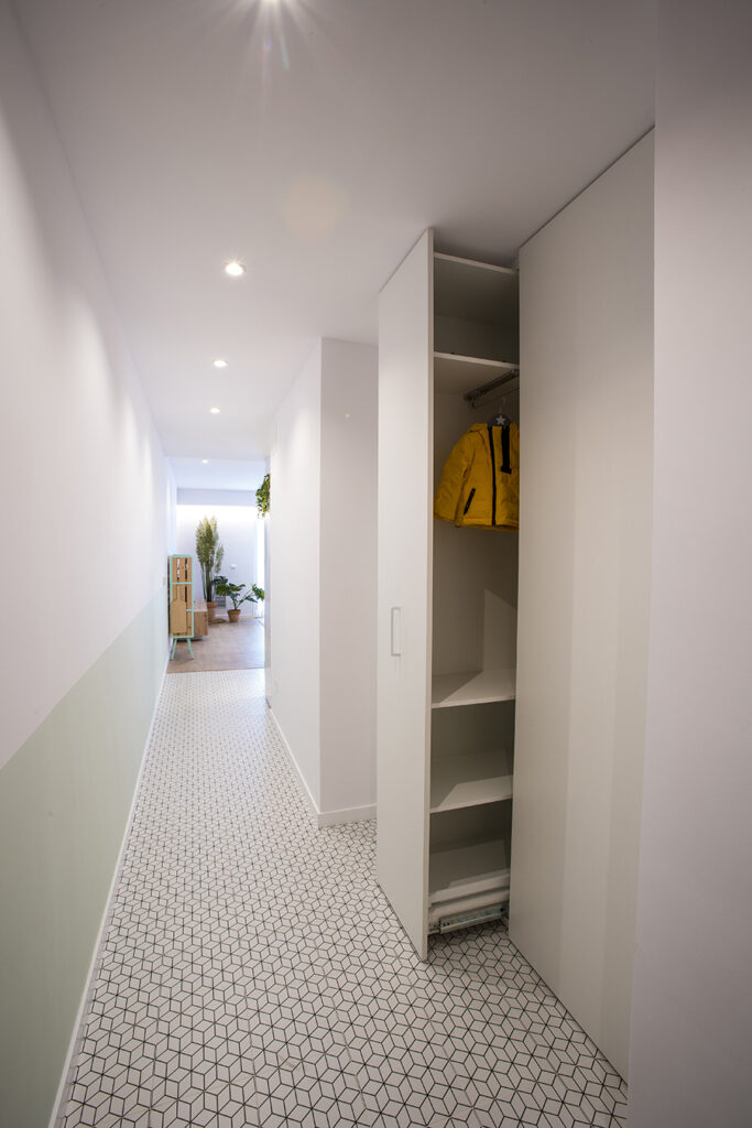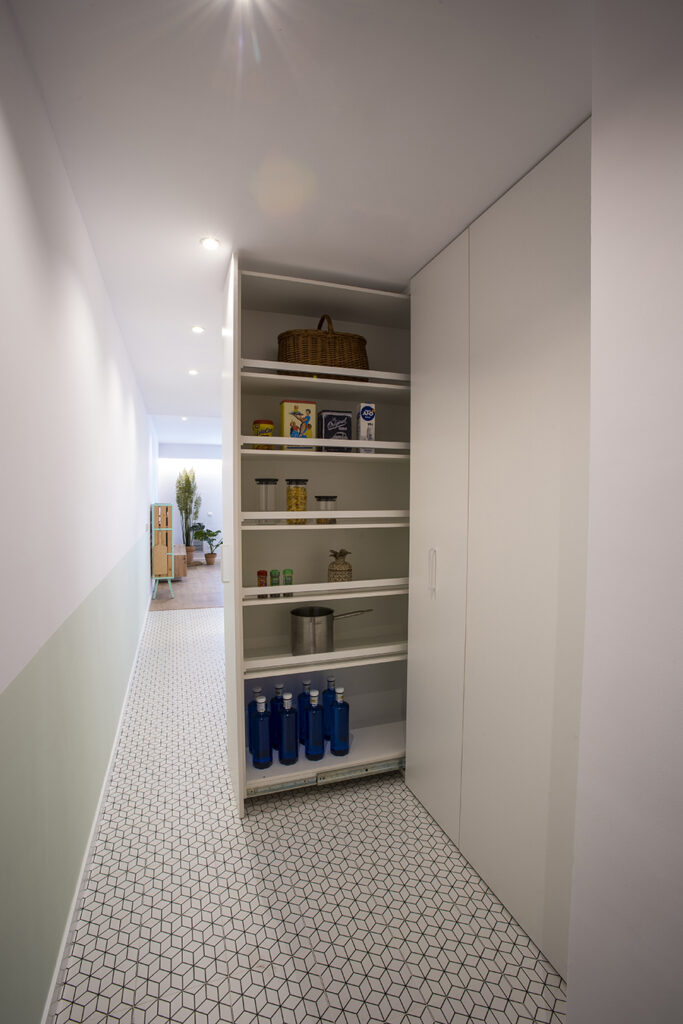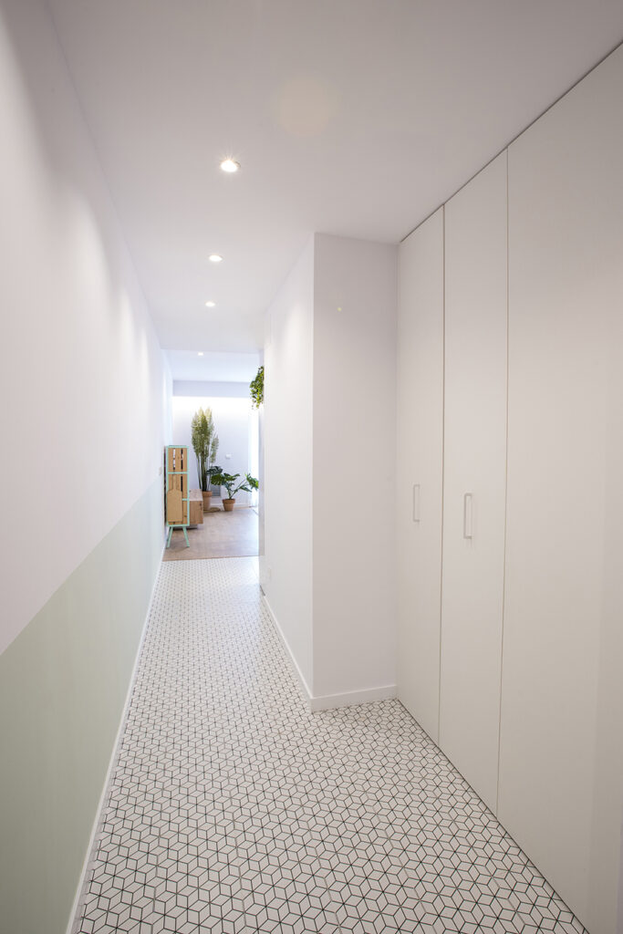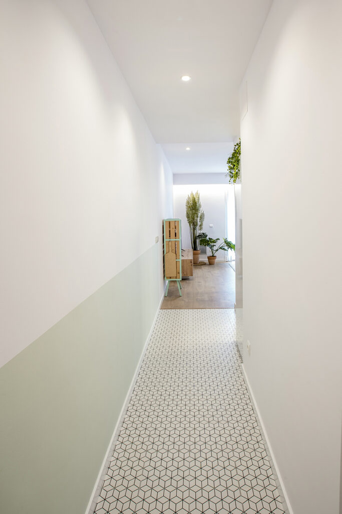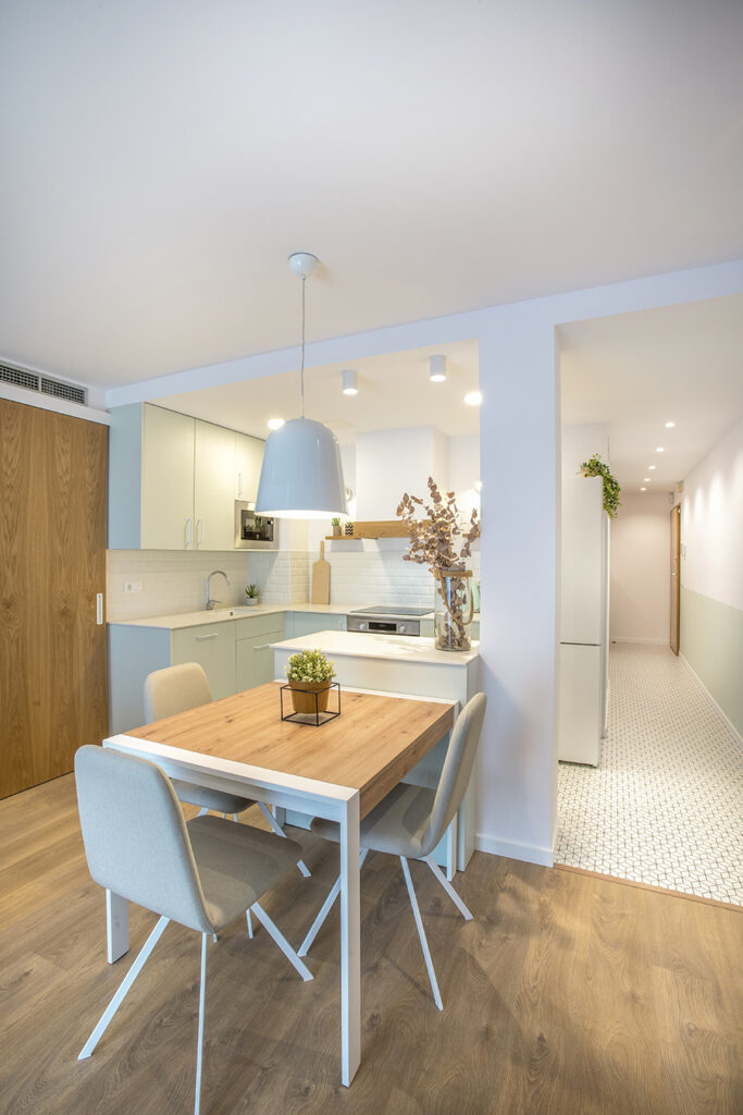 Es tracta d’una reforma integral i per tant, la cuina, el bany i tots els seus acabats i instal·lacions són nous. Donar sensació d’amplitud i lluminositat era imprescindible per crear una experiència agradable ja que la superfície habitable era reduïda. La cuina és oberta i es crea un efecte visual per generar una sensació de major amplitud pintant una franja del passadís amb el mateix color dels mobles.