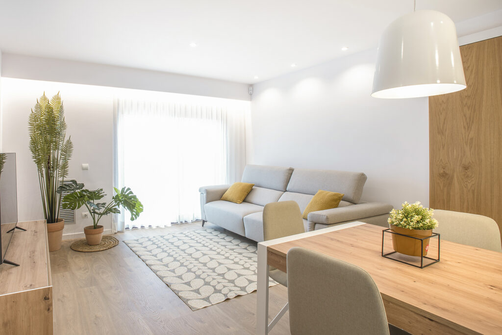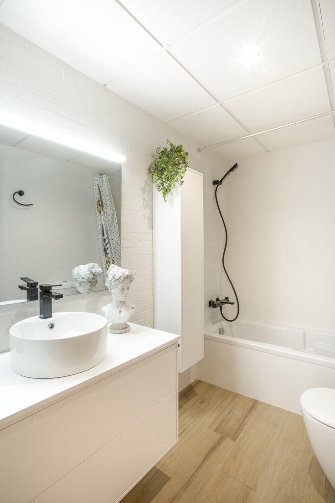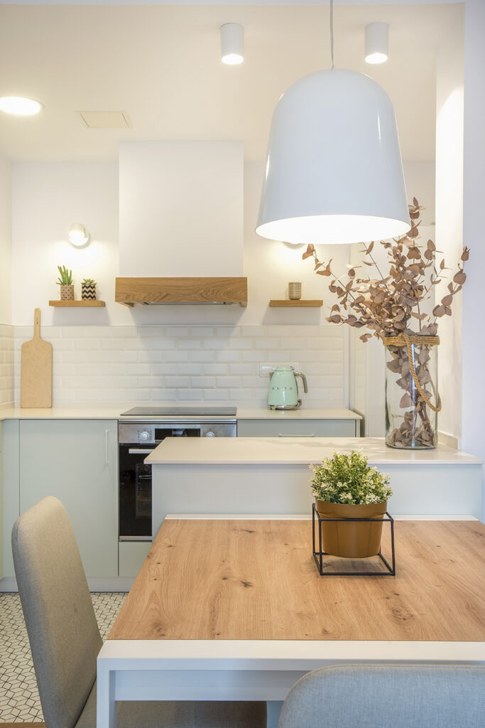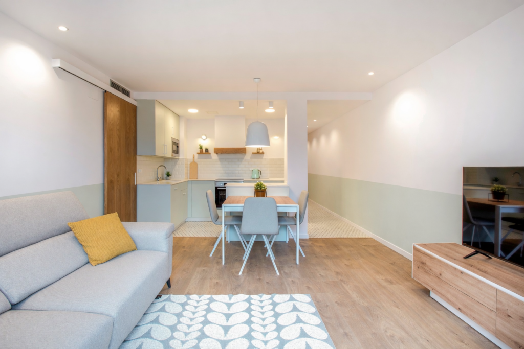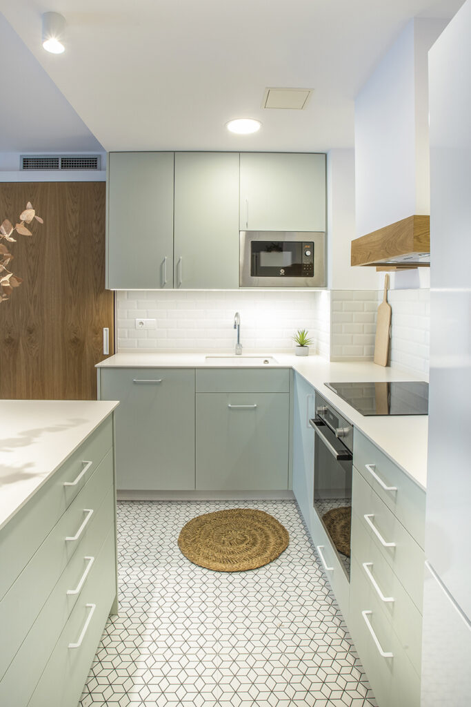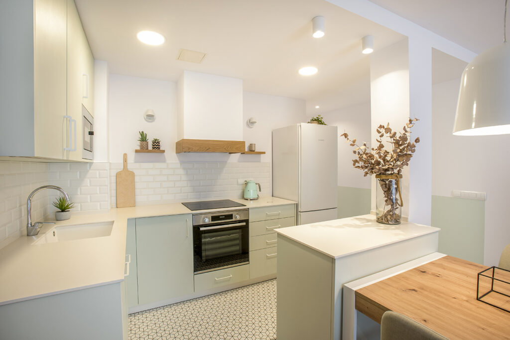 Es tracta d’una reforma integral i per tant, la cuina, el bany i tots els seus acabats i instal·lacions són nous. Donar sensació d’amplitud i lluminositat era imprescindible per crear una experiència agradable ja que la superfície habitable era reduïda. La cuina és oberta i es crea un efecte visual per generar una sensació de major amplitud pintant una franja del passadís amb el mateix color dels mobles.