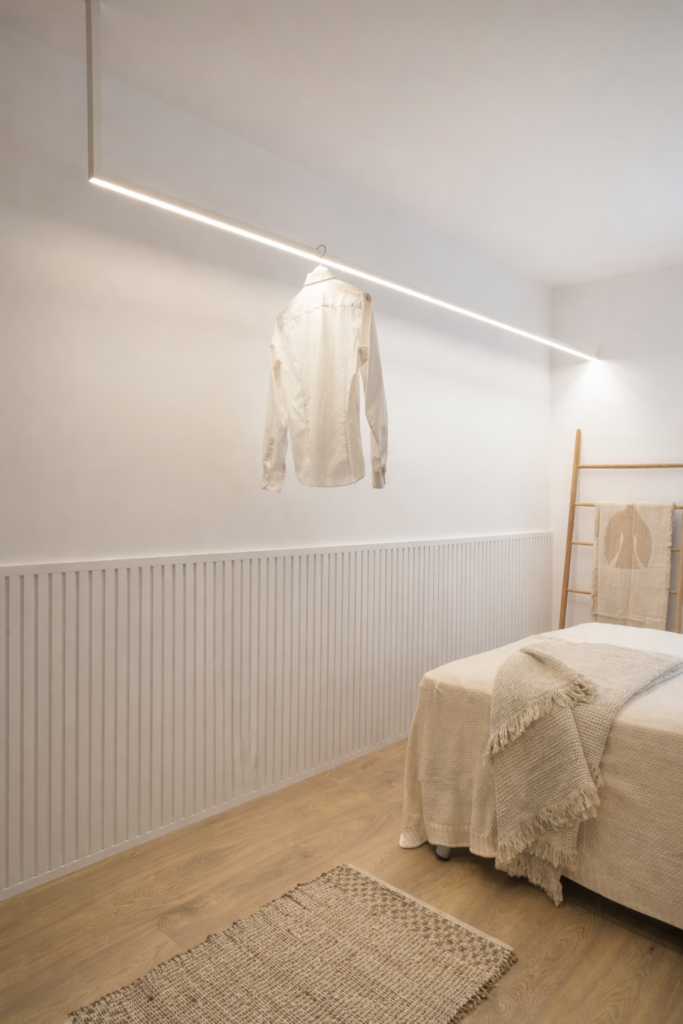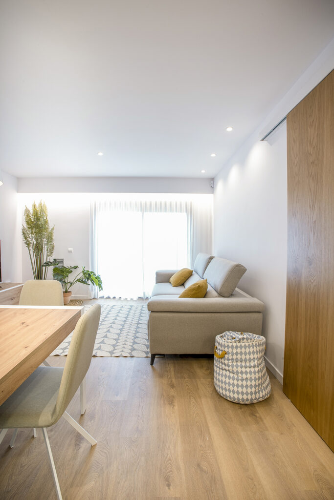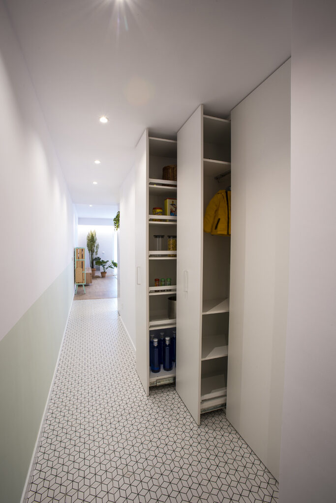 Aquest apartament és la segona residència d’una petita família. El principal repte que afrontava el projecte era resoldre l’accés de l’habitatge el qual es presentava en forma de passadís estret, llarg i poc lluminós. Per tant, es va optar per crear un vestíbul d’entrada que permetés rebre als seus inquilins d’una manera més amable i funcional. Es va dissenyar un petit traster per deixar les maletes i aparcar la bicicleta i llavors dues columnes extraïbles que actuaven com a armari-rebost i armari-rober. D’aquesta manera, els seus inquilins poden fer un “desembarcament” immediat i entrar a casa totalment alliberats.