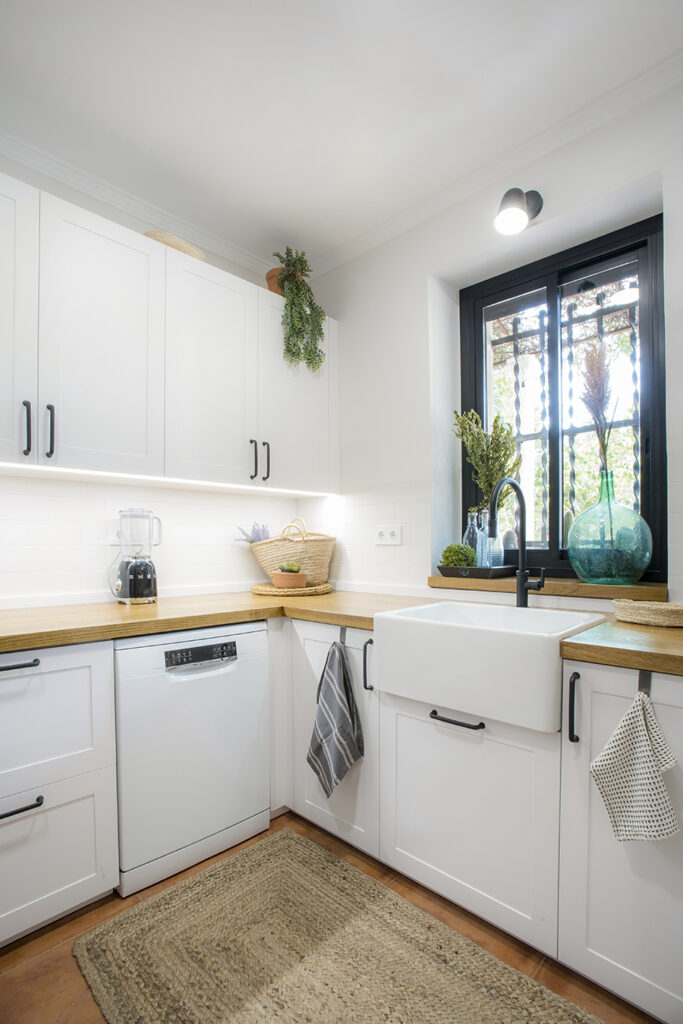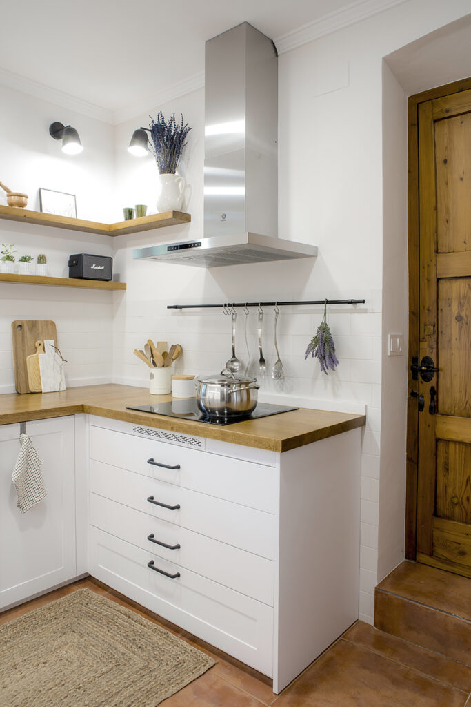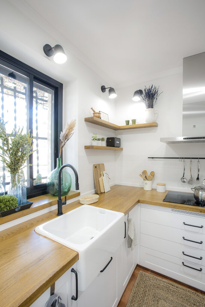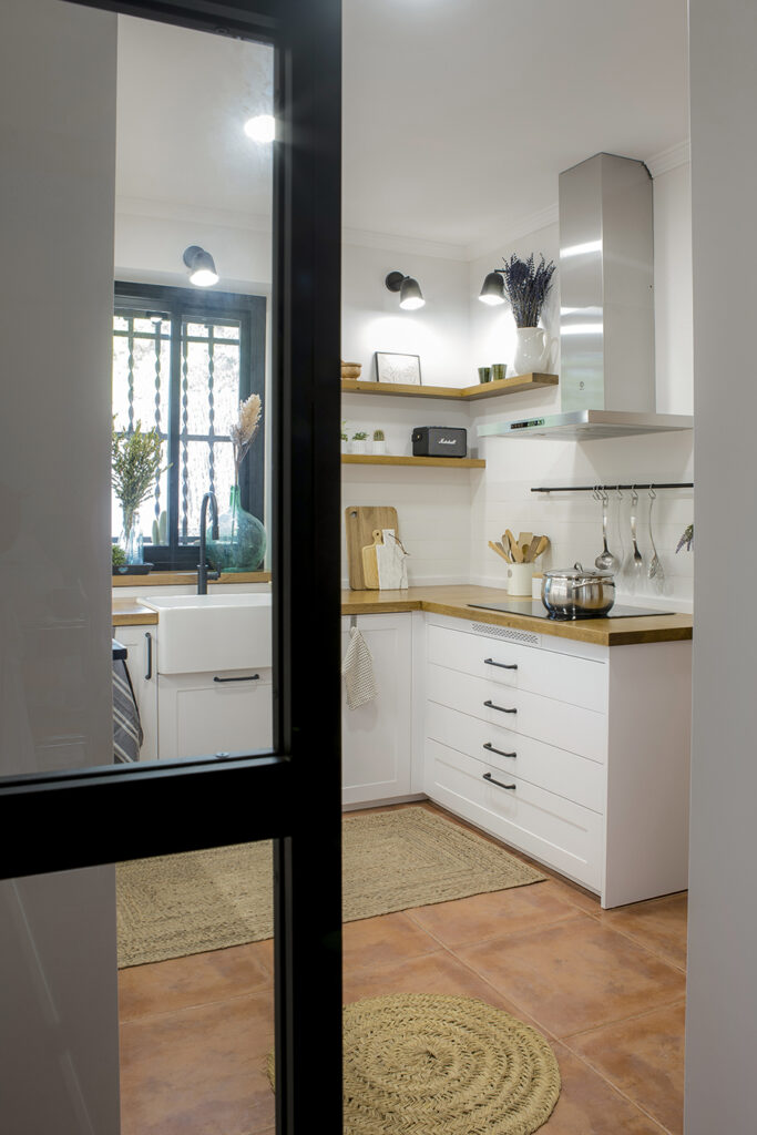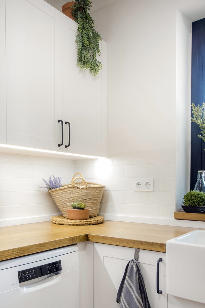 La cuina disposa d’una nova distribució i un mobiliari equipat per a un millor emmagatzematge i ús. El disseny de l’espai es resolt amb la voluntat de millorar l’experiència de la seva habitabilitat i crear un ambient més lluminós i agradable. La fusta de roure apareix en diferents elements i contrasta amb la resta de parts de tonalitats blanques. L’enrajolat a mitja altura i els detalls de forja li atorguen un càliu especial a la zona de major usabilitat. Finalment, diferents circuits lumínics generen diferents possibilitats i alhora ambients.