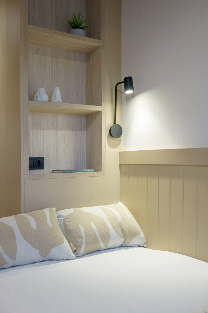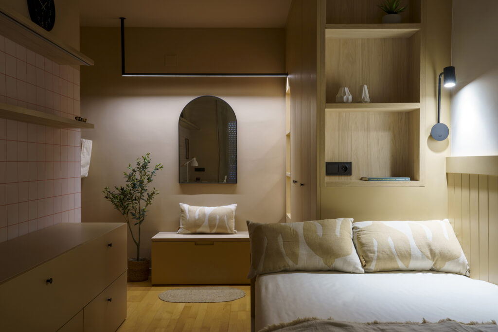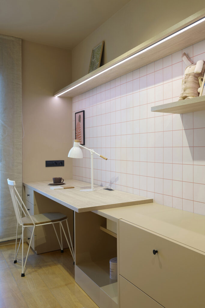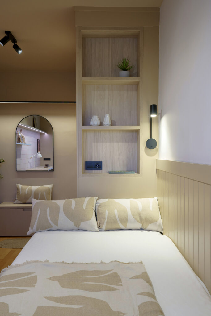 La il·luminació original obeïa a un criteri pràcticament uniforme, d’encesa total. Al projecte, com teníem perfectament delimitada cada zona vam voler atorgar una il·luminació idònia per a cada àmbit. La zona del descans disposa d’un petit aplic per a la lectura, a la zona de treball hi ha una llum led, al vestidor… El dormitori gaudeix d’un circuit lumínic que permet moltes possibilitats en funció de cada moment.