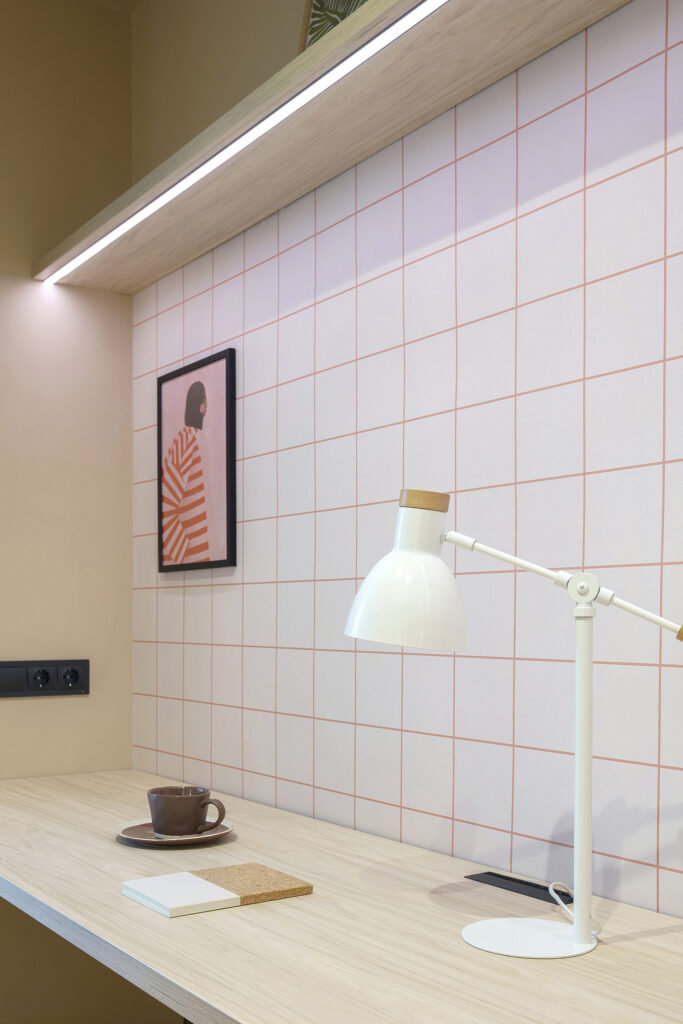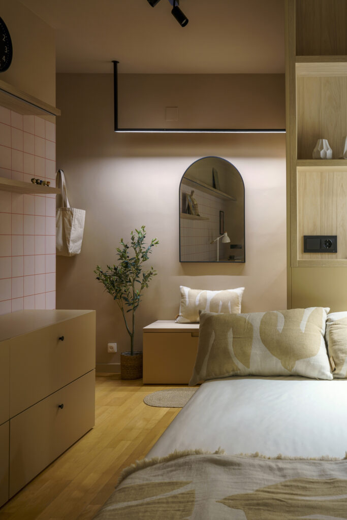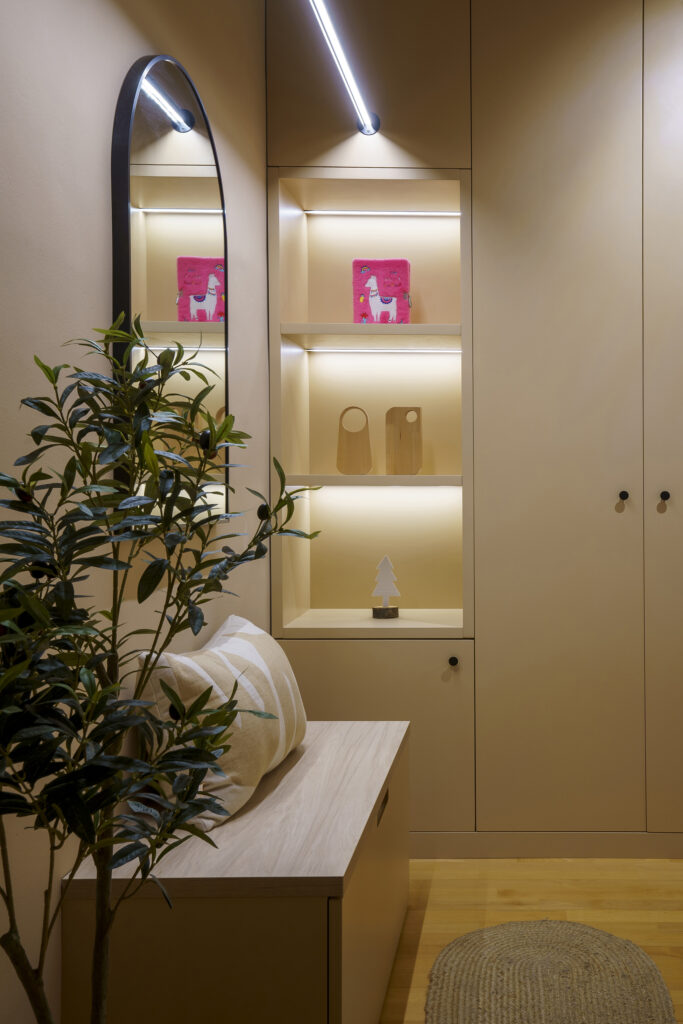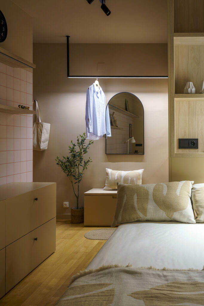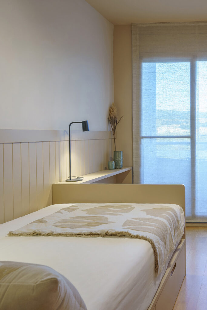 La il·luminació original obeïa a un criteri pràcticament uniforme, d’encesa total. Al projecte, com teníem perfectament delimitada cada zona vam voler atorgar una il·luminació idònia per a cada àmbit. La zona del descans disposa d’un petit aplic per a la lectura, a la zona de treball hi ha una llum led, al vestidor… El dormitori gaudeix d’un circuit lumínic que permet moltes possibilitats en funció de cada moment.