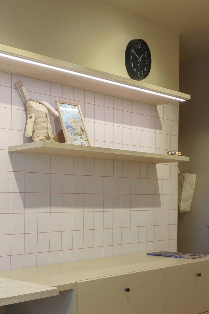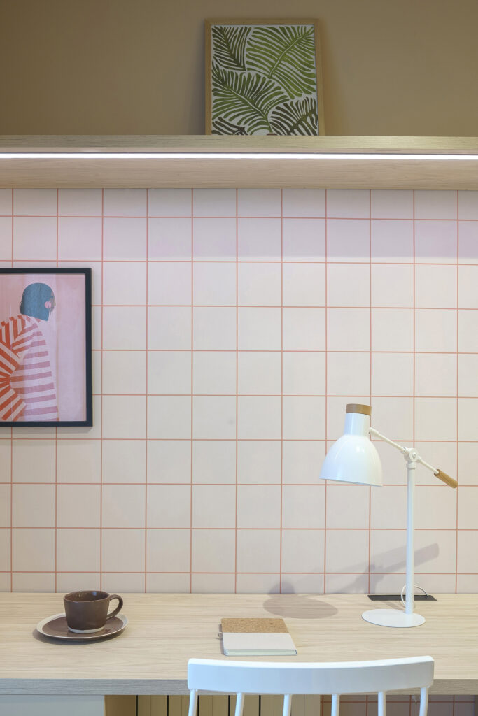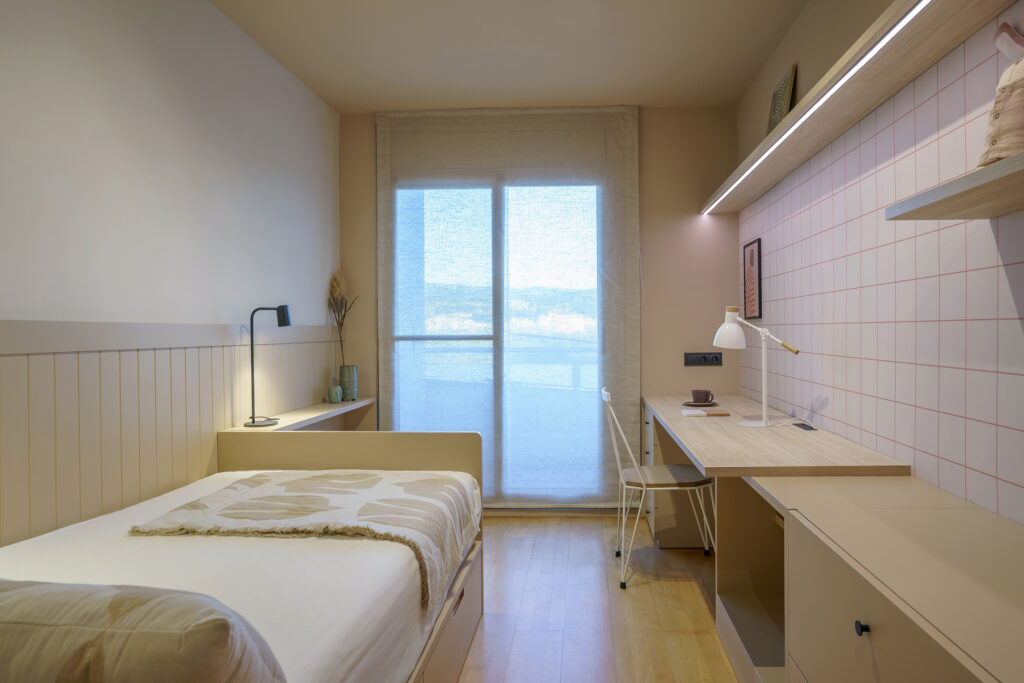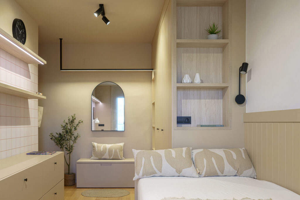 La paleta cromàtica és molt reduïda. Juguem amb un color nude, el negre i la fusta. La idea era escollir un color que fos juvenil però al mateix moment ens valgués per a quan aquesta habitació passés a estar utilitzada per a un adult.